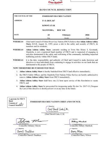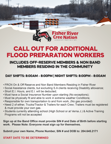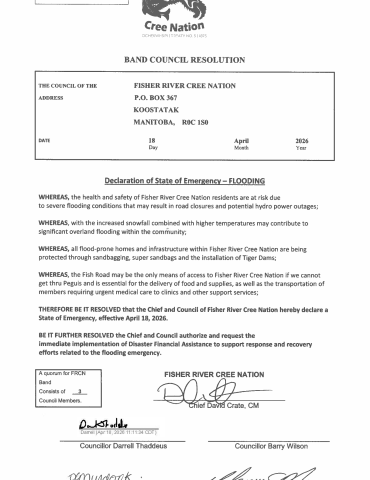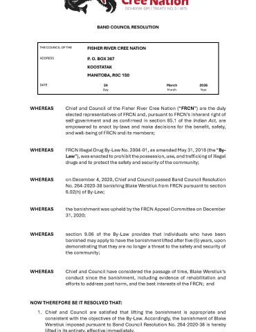 Fisher River Cree Nation is a community in which our history, language, traditions, and culture are paramount to who we are as a people. We will protect and maintain the spirit and intent of the treaties and our inherent rights. Fisher River will be a self-sustaining progressive community with a strong and accountable government. We will provide an environment where all people are healthy, safe, and respected.