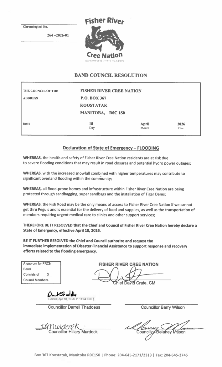 BCR 264-2026-01 | Fisher River Cree Nation declares a State of Emergency, effective April 18, 2026.