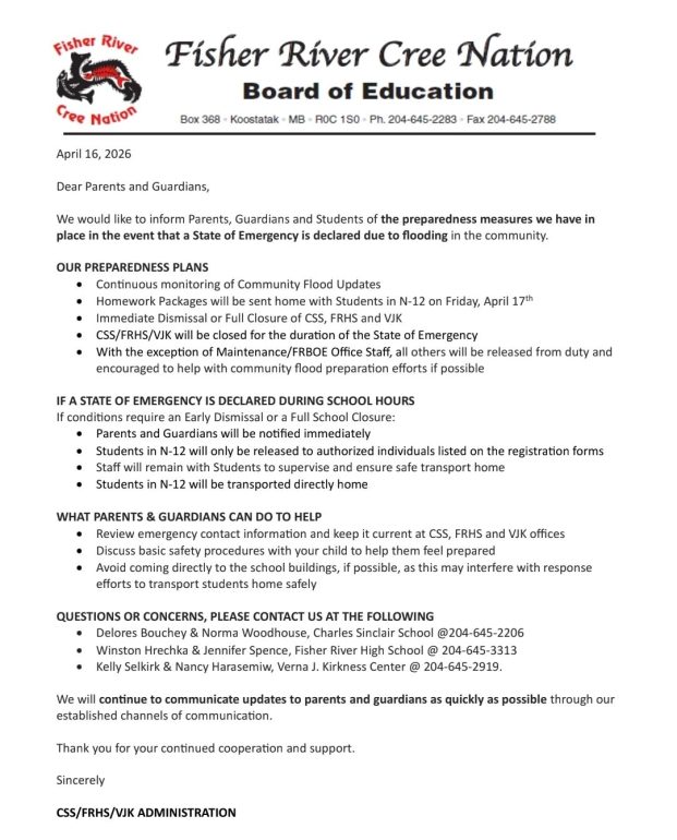 Fisher River Cree Nation is a community in which our history, language, traditions, and culture are paramount to who we are as a people. We will protect and maintain the spirit and intent of the treaties and our inherent rights. Fisher River will be a self-sustaining progressive community with a strong and accountable government. We will provide an environment where all people are healthy, safe, and respected.